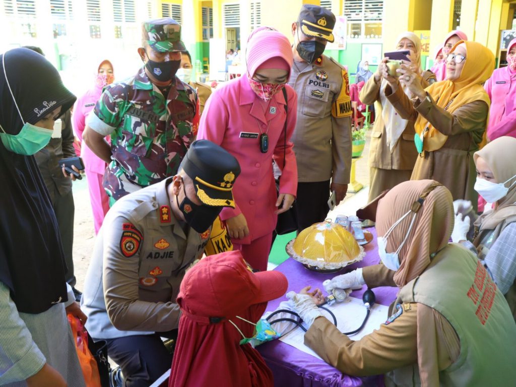 Kapolres Soppeng Bersama Ketua Bhayangkari Cabang Soppeng menghadiri langsung vaksinasi anak kerjasama dengan puskesmas Salotungo dipusatkan di SDN 3 Lemba.