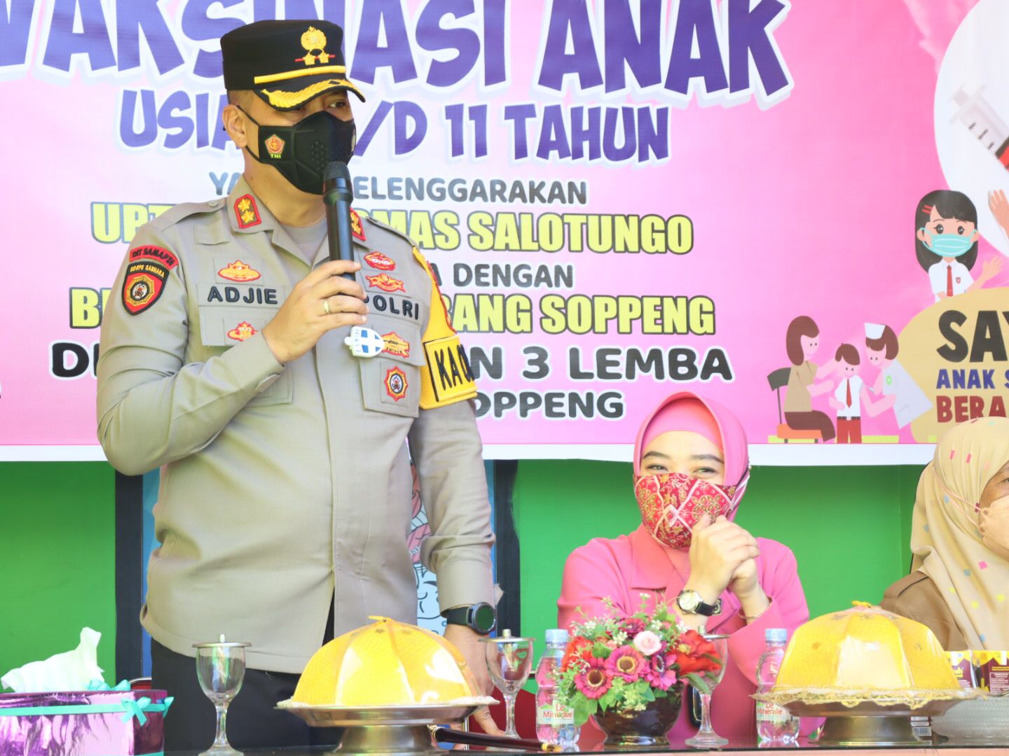 Kapolres Soppeng Bersama Ketua Bhayangkari Cabang Soppeng menghadiri langsung vaksinasi anak kerjasama dengan puskesmas Salotungo dipusatkan di SDN 3 Lemba.