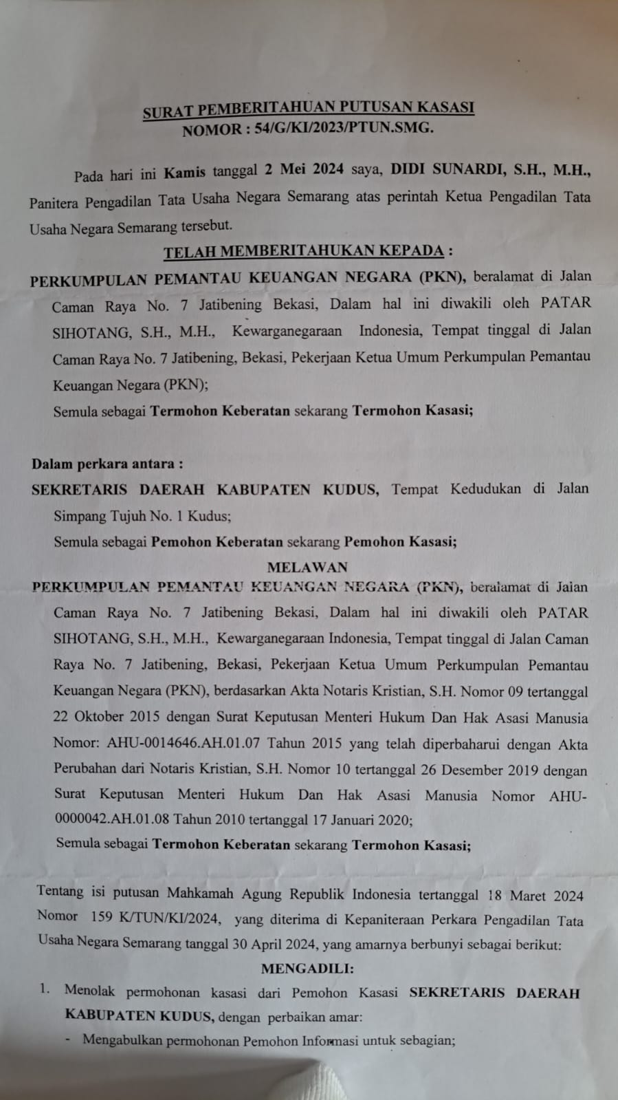 Nomor 159 K/TUN/KI/2024 pada tanggal 18 Maret 2024