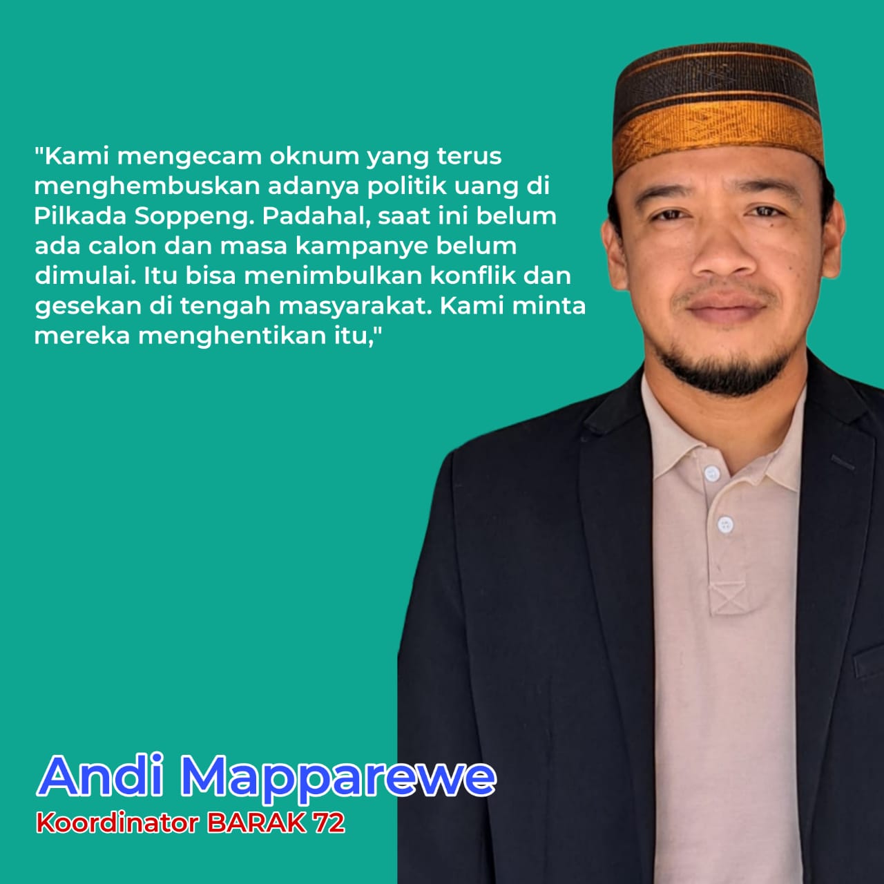 Barak 72, sebuah organisasi kepemudaan yang berbasis di Soppeng, menyebut, komentar yang menyebut pembagian sembako itu bagian dari pelanggaran pemilu dan berbau politik uang patut dikecam karena punya potensi menimbulkan konflik. “Sebab, itu bisa berpotensi menyebabkan kegaduhan di tengah masyarakat oleh karena pilkada sejatinya belum dimulai karena belum adanya calon yang sudah ditetapkan KPU Soppeng. Jadi, ketika ada pihak yang membagikan semacam paket sembako lalu kemudian ada pihak lain yang mempersoalkannya atau menghalangi dengan menganggap kegiatan itu sebagai politik uang, maka itu bisa melahirkan gesekan di masyarakat,” kata Andi Mapparewe, Koordinator Barak 72, Minggu, 1 September 2024, malam.