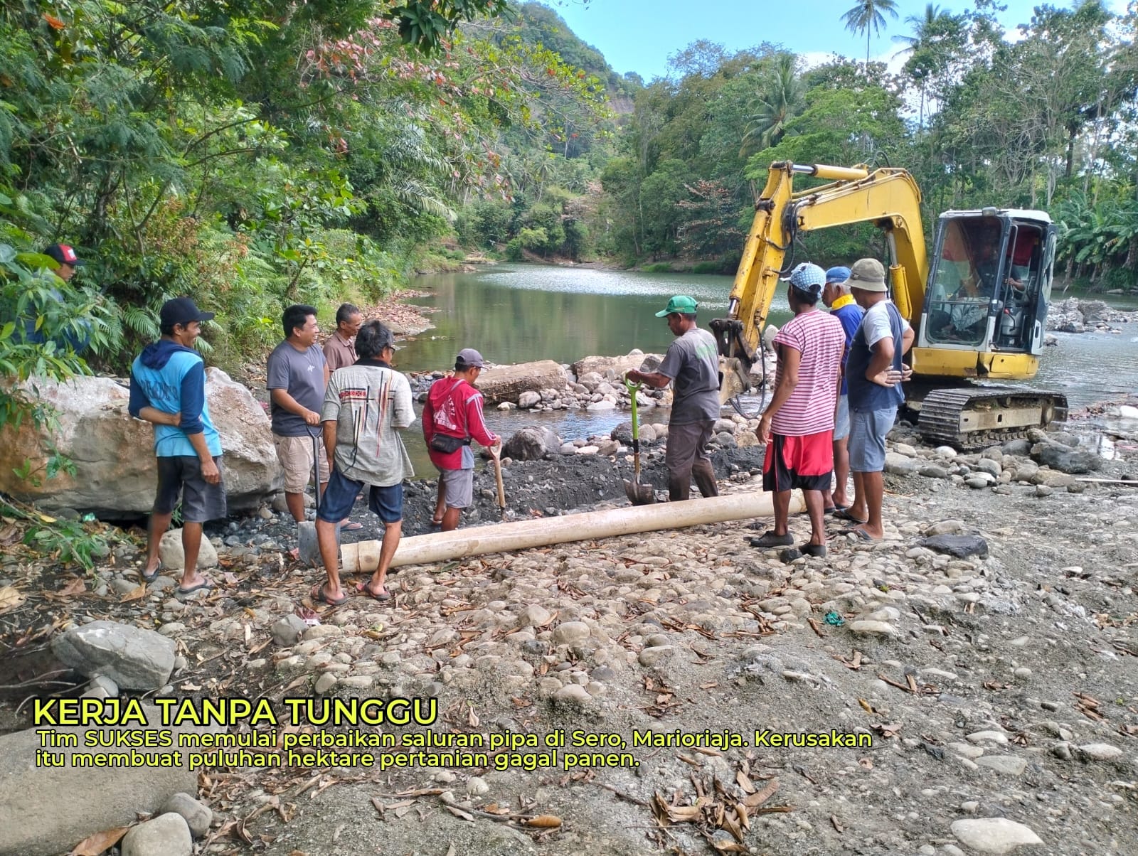 Saluran pipa ini rusak sejak dua tahun lalu dan membuat puluhan hektare tanah pertanian di area ini tak pernah lagi panen. “Sejak terjadinya banjir bandang dua tahun yang lalu sawah seluas 75 ha di Sero Desa Marioriaja, tidak pernah lagi melakukan panen padi akibat terputusnya jaringan distribusi irigasi pipa yang hanyut terbawa banjir di Sungai Sero. Saya coba komunikasikan dengan tim SUKSES, alhamdulillah mulai hari ini dikerjakan,” kata anggota DPRD Soppeng, Rusdiaman Tahir, yang juga tokoh muda di wilayah itu.