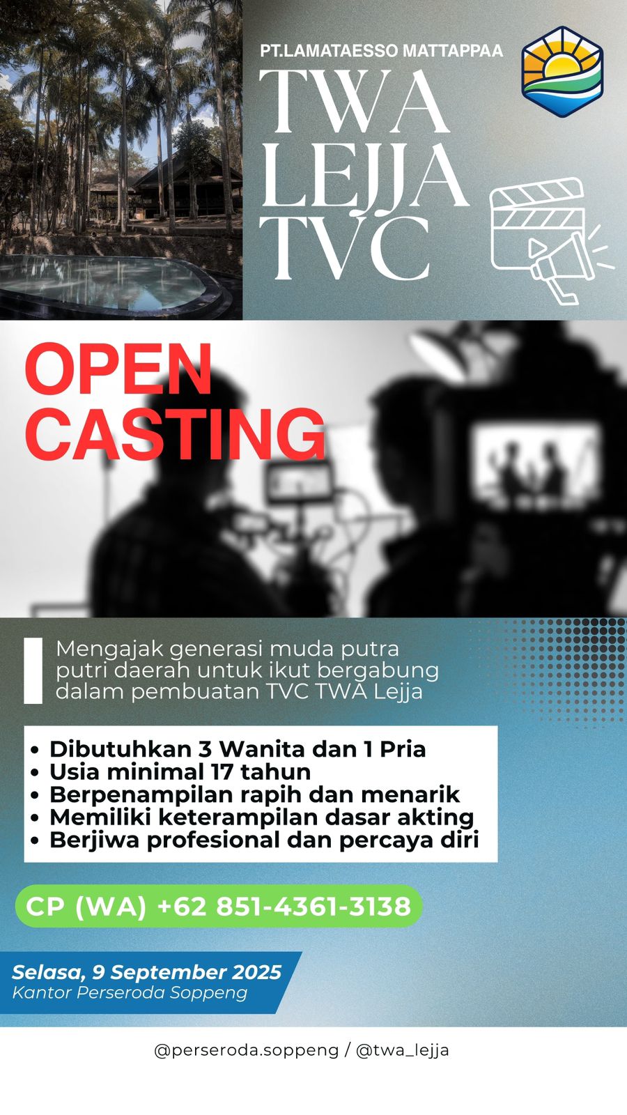 Soppeng, Spionase news. Com. PT. Lamataesso Mattappaa, pengelola Taman Wisata Alam (TWA) Lejja, menggelar open casting untuk pembuatan iklan layanan pariwisata atau Television Commercial (TVC) TWA Lejja. Inisiatif ini merupakan bagian dari strategi promosi wisata daerah yang bertujuan meningkatkan daya tarik destinasi unggulan Kabupaten Soppeng.