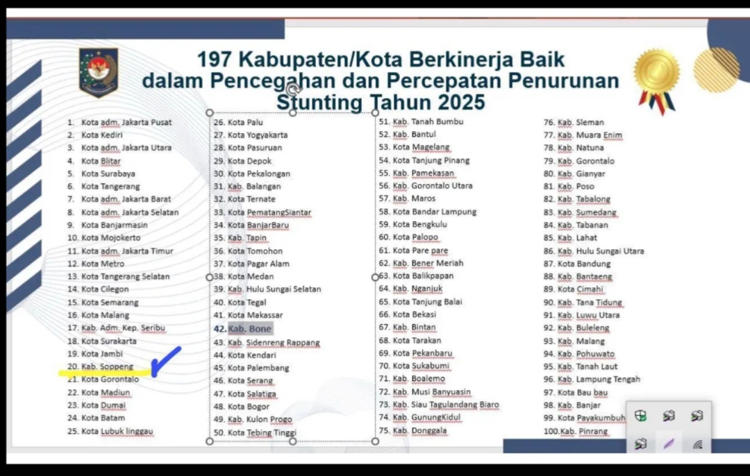 SOPPENG–Spionasenews.com. Kabupaten Soppeng kembali mencatatkan prestasi membanggakan di skala nasional. Dalam rilis resmi daftar 197 Kabupaten/Kota Berkinerja Baik dalam Pencegahan dan Percepatan Penurunan Stunting Tahun 2025, Soppeng menempati peringkat 20 secara nasional dan sekaligus menjadi yang terbaik di Provinsi Sulawesi Selatan, Kamis (11 November 2025).