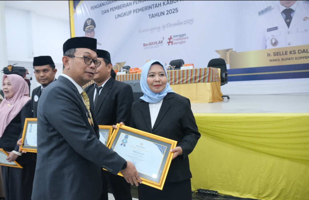 SOPPENG–Spionase news. Com. Suasana khidmat menyelimuti Gedung Pertemuan Kabupaten Soppeng pada hari Jumat (19/12/2025) ketika Pemerintah Kabupaten Soppeng melaksanakan penganugerahan tanda kehormatan Satyalancana Karya Satya dan pemberian penghargaan kepada Aparatur Sipil Negara (ASN) berprestasi. Acara yang dihadiri oleh jajaran pejabat daerah, tokoh masyarakat, dan keluarga penerima penghargaan dipimpin langsung oleh Bupati Soppeng H. Suwardi Haseng SE, yang juga secara langsung menyematkan tanda kehormatan kepada para penerima.