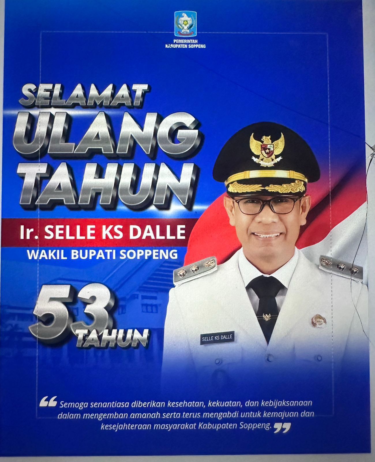 Soppeng–Spionasenews. Com, Wakil Bupati Soppeng periode 2025-2030, Ir. Selle KS Dalle, merayakan hari ulang tahun ke-53 pada hari ini, 28 Desember 2025. Momentum spesial ini dihiasi dengan ucapan selamat dan doa dari berbagai elemen masyarakat, termasuk dari kalangan pers melalui Ketua Aliansi Jurnalis Online Indonesia (AJOI) Jamal Hasan Basir.