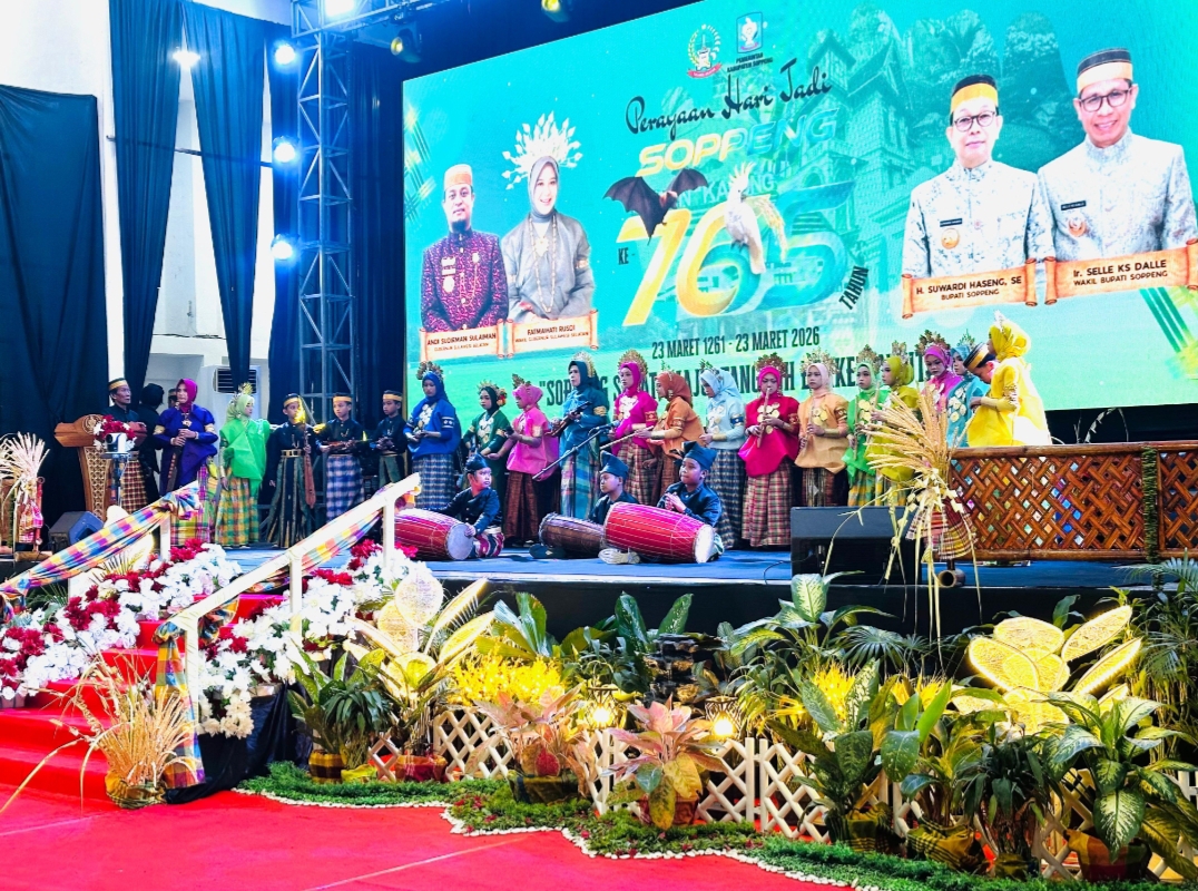 Kostum yang dikenakan pun semakin menambah kesan indah dan megah, sejalan dengan tema perayaan yang kental akan nuansa adat Bugis-Soppeng. Penampilan yang memukau ini berhasil mengundang decak kagum dan tepuk tangan meriah dari seluruh hadirin, termasuk para tamu kehormatan yang hadir memadati gedung.